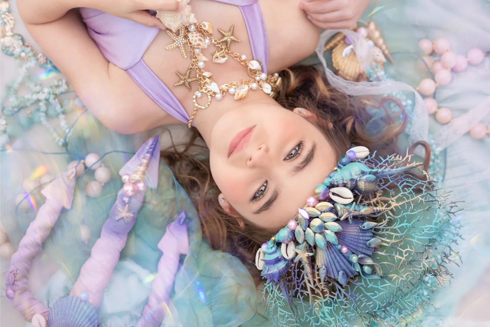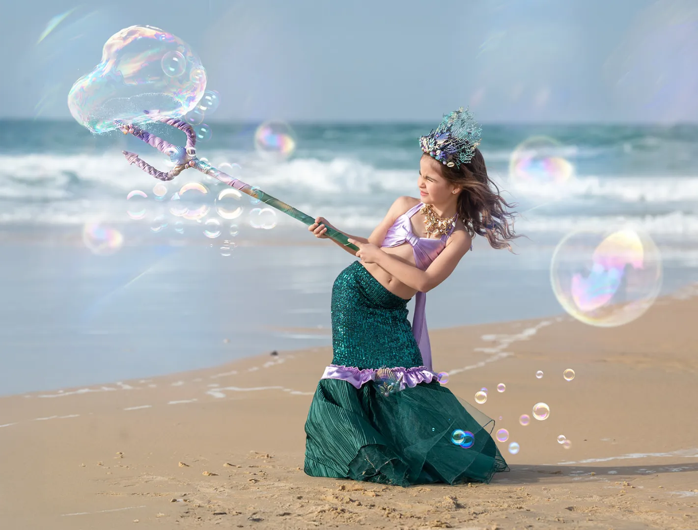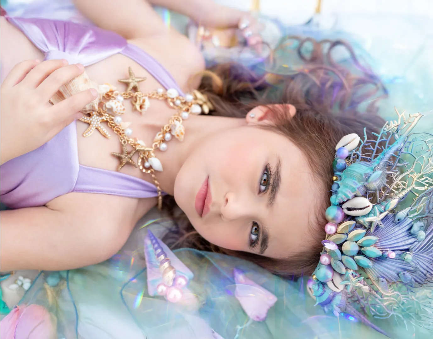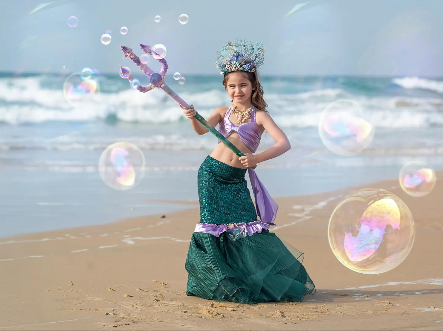 תחפושת שכולה קסם עם התעמקות בפרטים הכי קטנים . בחירת הבדים המושלמת בגזרה מחמיאה לכל ילדה התחפושת כוללת: חצאית סנפיר מפייטים בשילוב טול חזיה מתוכשטת שרשרת אוצרות ים כתר מפואר בעבודת יד בשילוב אבנים צדפים וקסם בקונספט הים סיכת בגד צדפה בשילוב אבנים מנצנצות יתן להוסיף קלשון בתוספת 200 ש״ח
