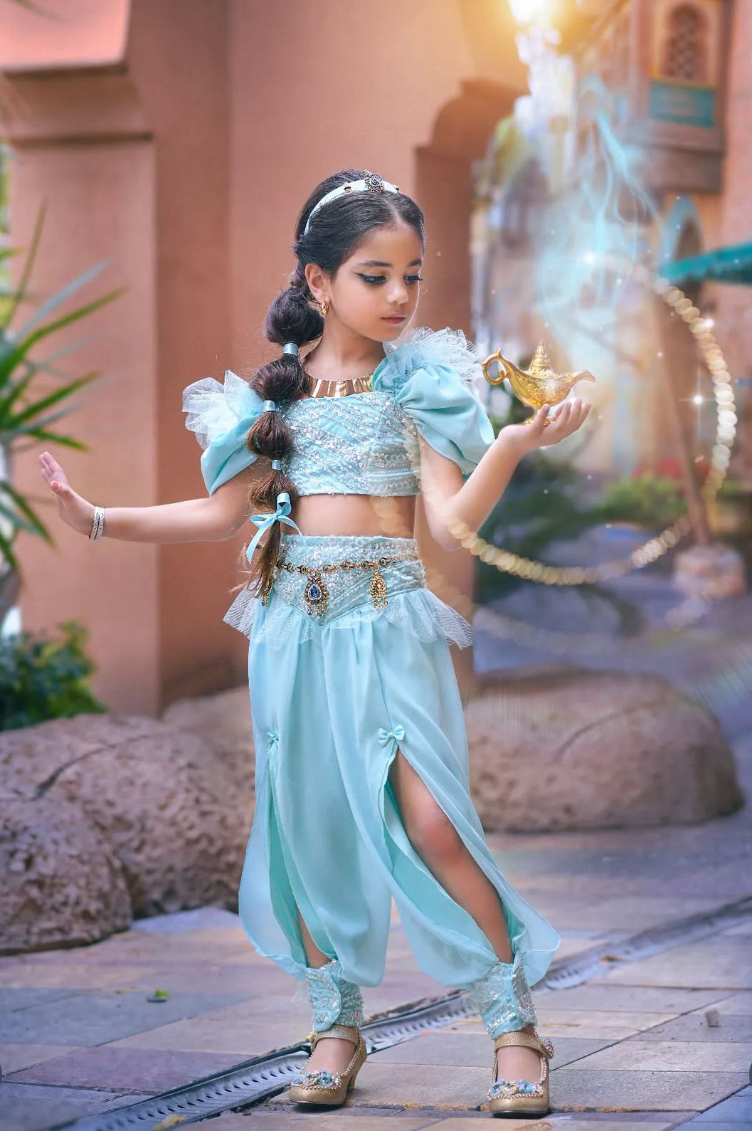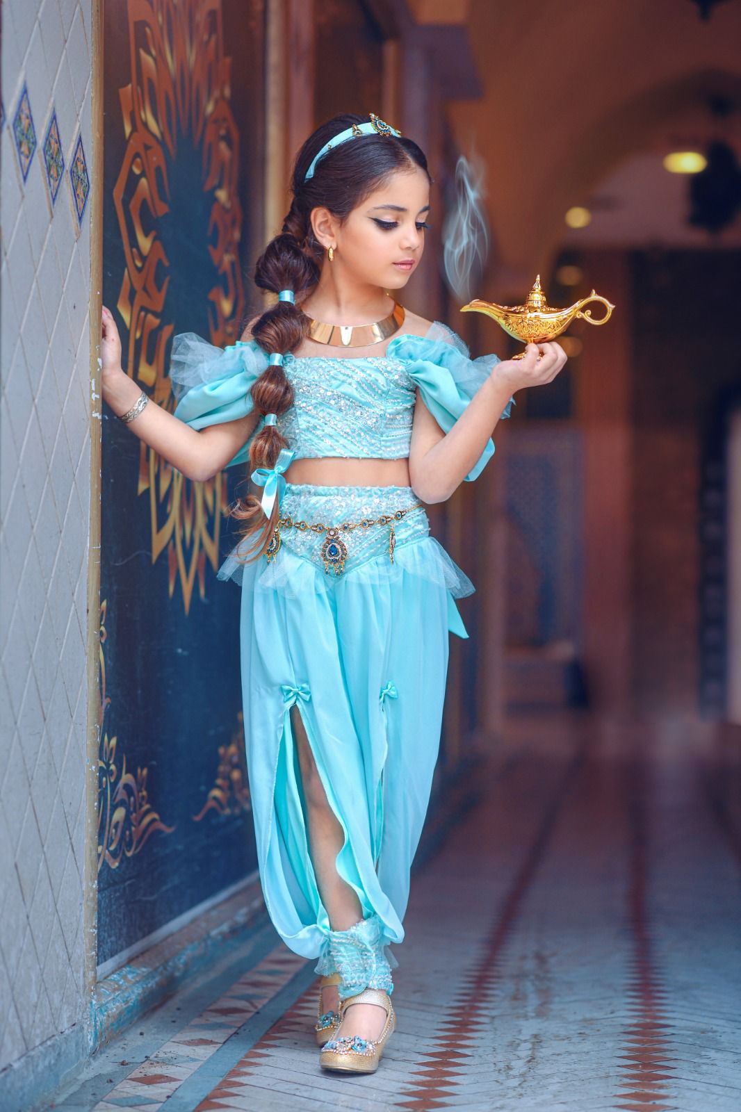 הנסיכה יסמין תחפושת יוקרתית ומרהיבה בגזרה ייחודית ומחמיאה. תפורה בדי יוקרה בתפירת הוט קוטור . התחפושת כוללת: מכנס טופ תכשיט מותן תכשיט ראש שרשרת עגילים מנורת קסמים